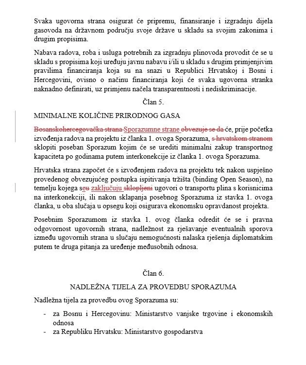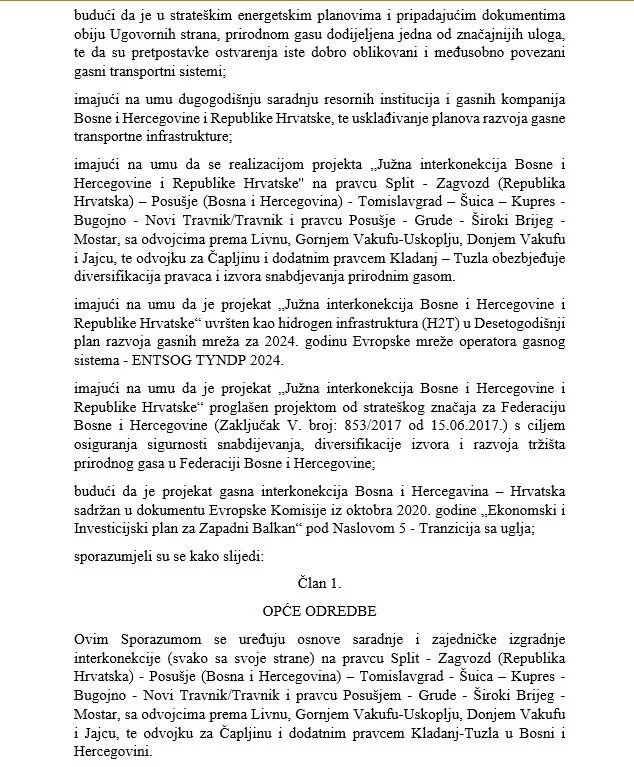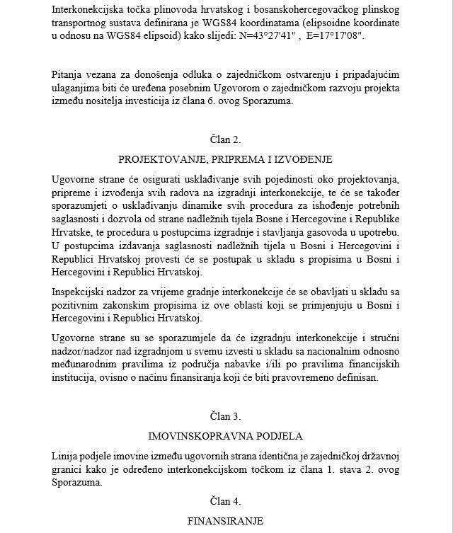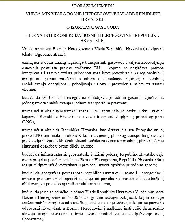 “Vijeće ministara Bosne i Hercegovine i Vlada Republike Hrvatske usaglasili su sporazum kojim se uređuju osnove saradnje i izgradnje gasovoda Južna interkonekcija između dvije države”, navodi se na početku.
