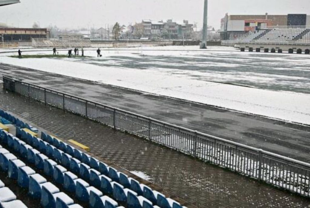 Gradski stadion jutros je osvanuo pod novim bijelim pokrivačem, a dodatni problem predstavlja činjenica da teren nema hibridnu podlogu, što održavanje u zimskim uslovima čini posebno zahtjevnim.