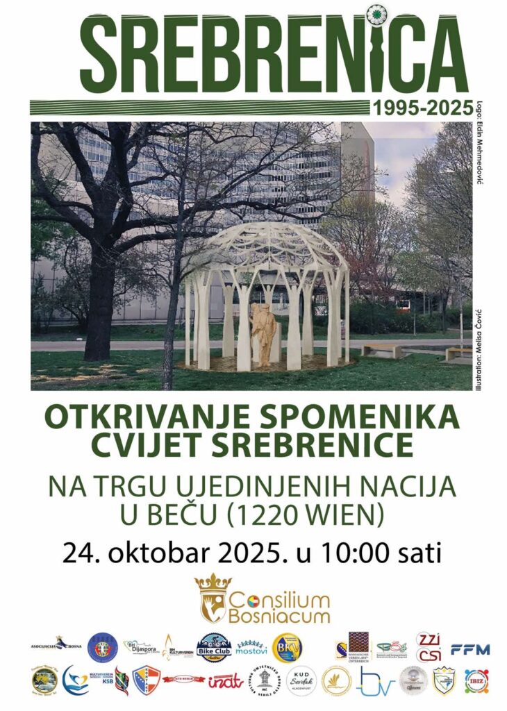 Na Trgu Ujedinjenih nacija u Beču, neposredno ispred zgrade Ujedinjenih nacija, 24. oktobra bit će svečano otvoren spomenik „Cvijet Srebrenice“.