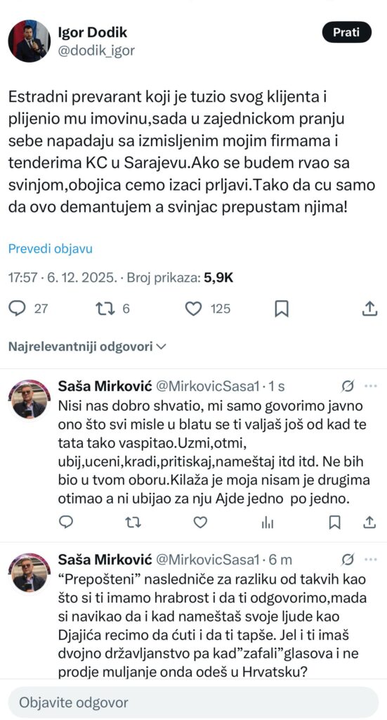 NaslovnicaIzdvojeno Igor brani Dodika, Mirković ne popušta ni oca ni sina! 6. Decembra 2025. FACE Portal FacebookTwitterLinkedinViberWhatsApp - Advertisement - Milorad Dodik šuti, a brani ga sin Igor, no Mirković napada i oca i sina. PODSJEĆAMO VAS NA GOSTOVANJE MIRKOVIĆA I LUKASA NA FACE TV. - OGLAS - Pročitajte još CD CENTRALNI DNEVNIK – 6. 12. 2025. CD ŠOKANTNO: Zlatko, sin Kapetana Hajre: “Mog oca je izdao vojni i politički vrh BiH!” Izdvojeno Mirković: “Dodik avionom otišao na Kipar! U banku?” CD Salihović upozorava: “Bošnjak ili Bosanac? Ovo je recept kako uništiti jedan narod!” NAJNOVIJEFACE.BA CD CENTRALNI DNEVNIK – 6. 12. 2025. CD ŠOKANTNO: Zlatko, sin Kapetana Hajre: “Mog oca je izdao vojni i politički vrh BiH!” Izdvojeno Mirković: “Dodik avionom otišao na Kipar! U banku?” CD Salihović upozorava: “Bošnjak ili Bosanac? Ovo je recept kako uništiti jedan narod!” CD Ukrajina ne želi biti BiH! Komandant odbija nepravedni mir i ne želi dati teritorije Rusiji! CD Cijela BiH tuguje za Zdravkom Maroševićem! Proglašen Dan žalosti u Varešu Najnovije na Face TV CD CENTRALNI DNEVNIK – 6. 12. 2025. CD ŠOKANTNO: Zlatko, sin Kapetana Hajre: “Mog oca je izdao vojni i politički vrh BiH!” CD Salihović upozorava: “Bošnjak ili Bosanac? Ovo je recept kako uništiti jedan narod!” CD Ukrajina ne želi biti BiH! Komandant odbija nepravedni mir i ne želi dati teritorije Rusiji!