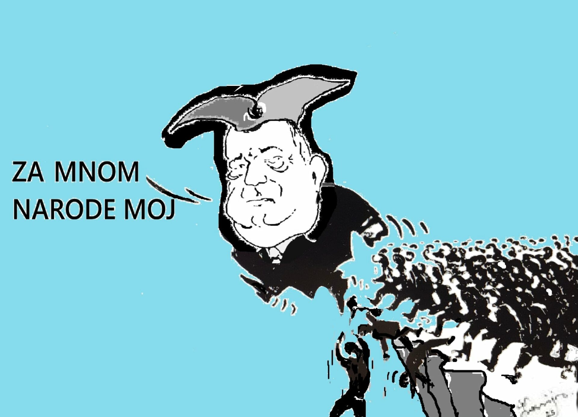 U karikaturi naslovljenoj „Za mnom, narode moj“, Meholjić prikazuje političkog vođu Dodika koji, noseći trokutasti šešir u stilu vojskovođe, poziva masu da ga slijedi. Iza njega, u dugoj koloni, kreću stotine bezličnih figura – simbol naroda koji slijepo ide za svojim vođom.