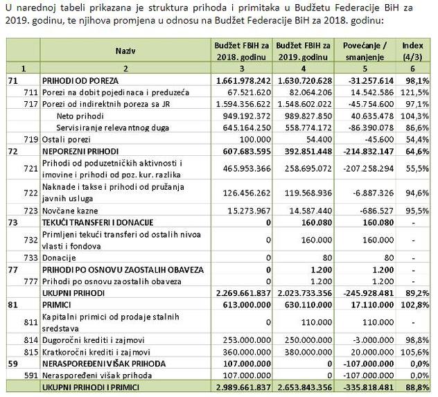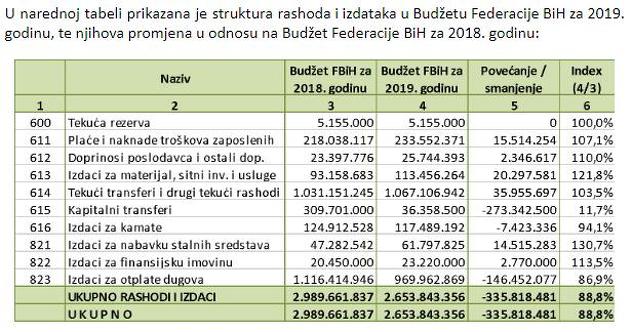 Ukupni rashodi i izdaci u budžetu Federacije BiH za 2019. godinu iznose 2.653.843.356,00 KM, što predstavlja smanjenje za 335,8 miliona KM ili 11posto u odnosu na budžet za 2018. godinu.