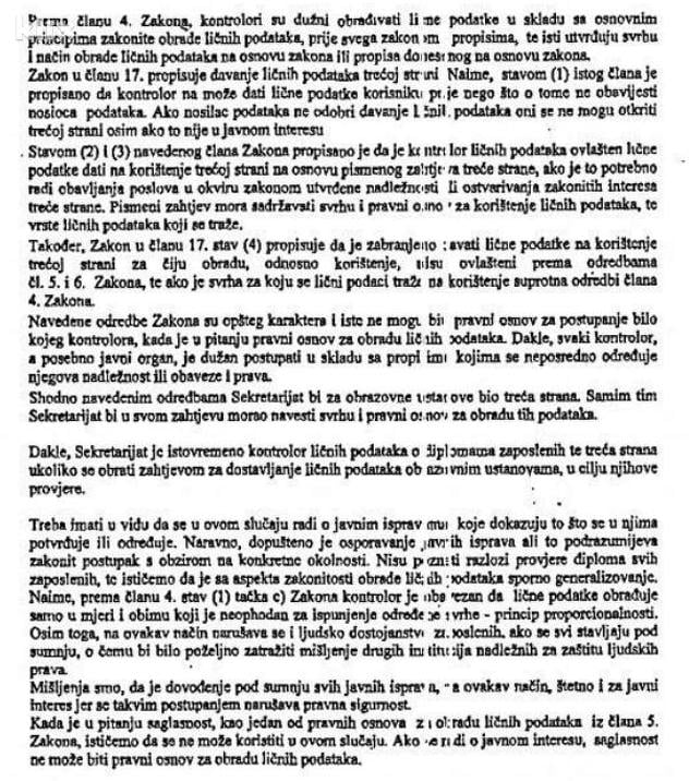 Dalje stoji da budući da nisu poznati razlozi provjere diploma svih zaposlenih, s aspekta zakonitosti obrade ličnih podataka sporno je generaliziranje jer je po zakonu kontrolor dužan da lične podatke obrađuje samo u mjeri i obimu koji je neophodan za ispunjenje određene svrhe.