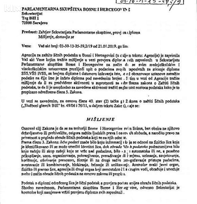 U vezi s tim podatak o diplomi određenog lica je lični podatak a provjera podrazumijeva obradu ličnih podataka. Shodno navedenom, Parlamentarna skupština BiH, odnosno Sekretarijat je kontrolor koji namjerava vršiti provjeru diploma svih zaposlenih.