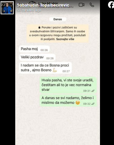 “Šta znače pobjede, nada i interesovanje… kad ti maestro fudbala Luka Modrić sinoć, odmah nakon pobjede Hrvatske nad Crnom Gorom, pošalje poruku: ‘Hajmo Bosno.’ Hvala mu. A mi danas moramo vjerovati da možemo. Idemo!”, napisao je Topalbećirević na Facebooku uz screenshot Modrićeve poruke koju je dobio.