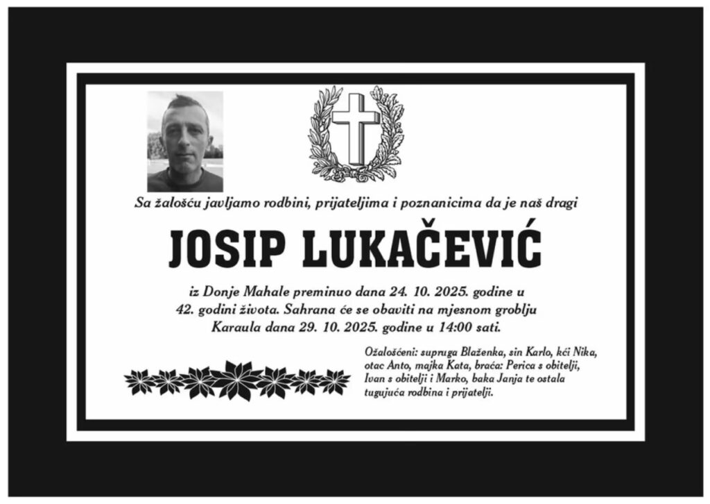 Bivši fudbaler i nekadašnji reprezentativac Bosne i Hercegovine, Josip Lukačević, bit će sahranjen sutra, 29. oktobra, na mjesnom groblju Karaula u Donjoj Mahali kod Orašja.