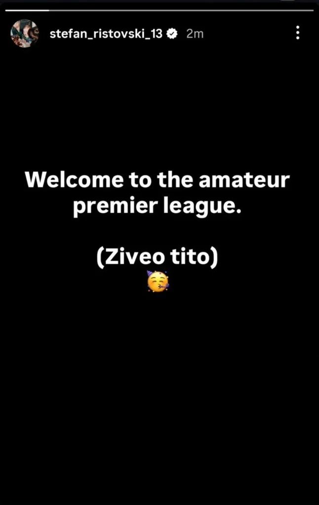 Makedonski internacionalac odlučio je da objavi na društvenim mrežama poruku na engleskom: “Welcome to the amateur Premier league. (Ziveo tito)”, a prevod vjerujemo nije neophodan.