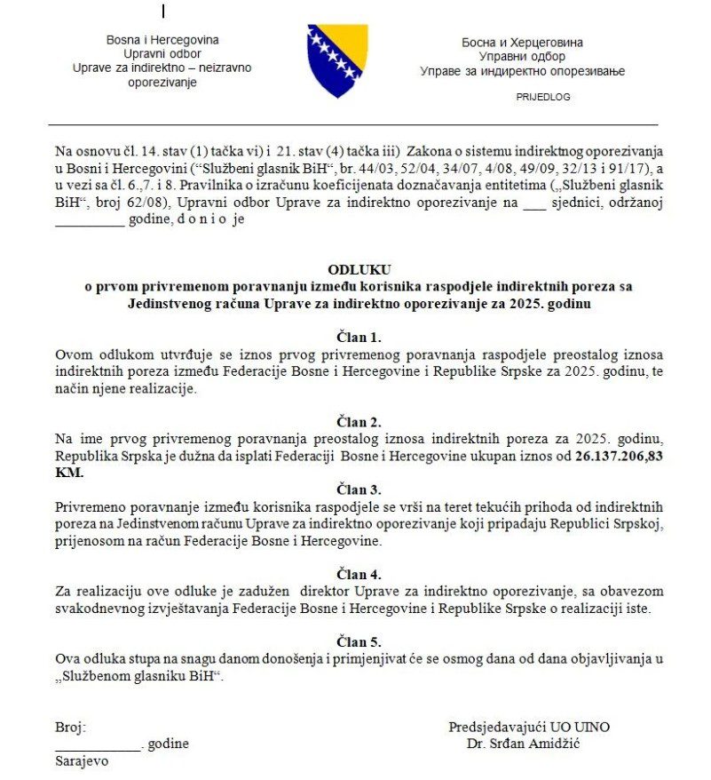 Uprava za indirektno oporezivanje, na čijem čelu je Zoran Tegeltija (SNSD), redovno dostavlja odluke o poravnanju između korisnika (FBiH, RS i Brčko distrikt) raspodjele indirektnih poreza sa Jedinstvenog računa UIO, ali onda na scenu stupa Srđan Amidžić koji, kao predsjedavajući Upravnog odbora, odbija i staviti ovu tačku na dnevni red.