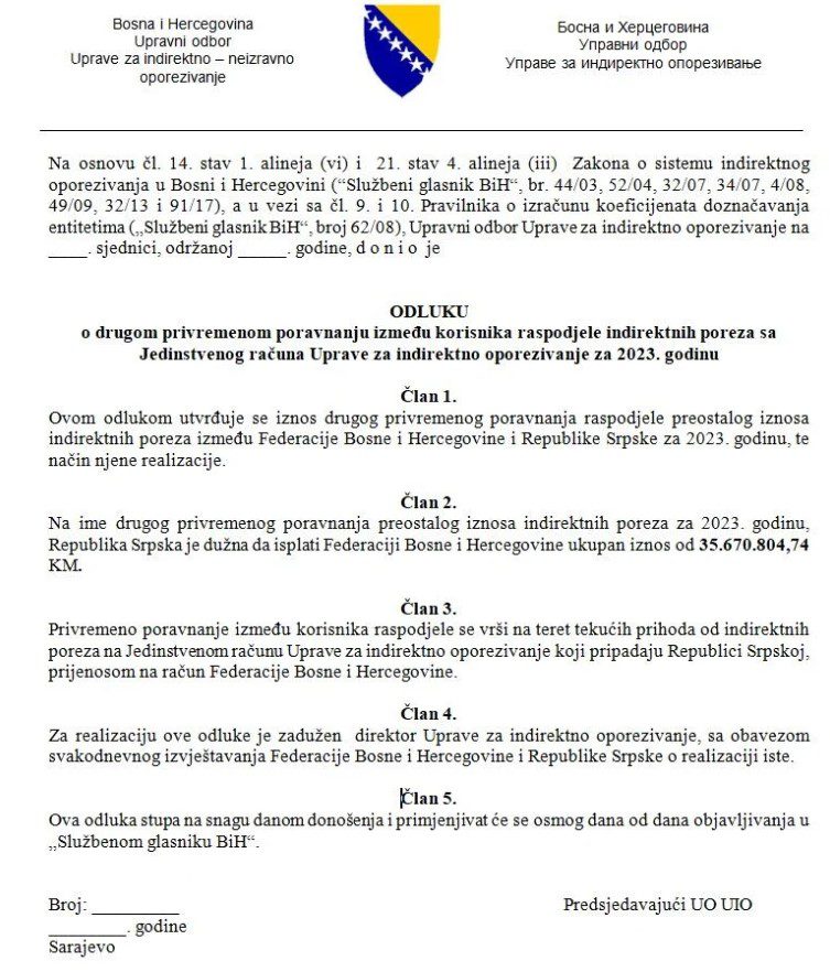 On traži da se poštuje zakon i deblokira raspodjela sredstava među entitetima i Brčko distriktom te utvrde novi koeficijenti koji se inače utvrđuju svaka tri mjeseca.