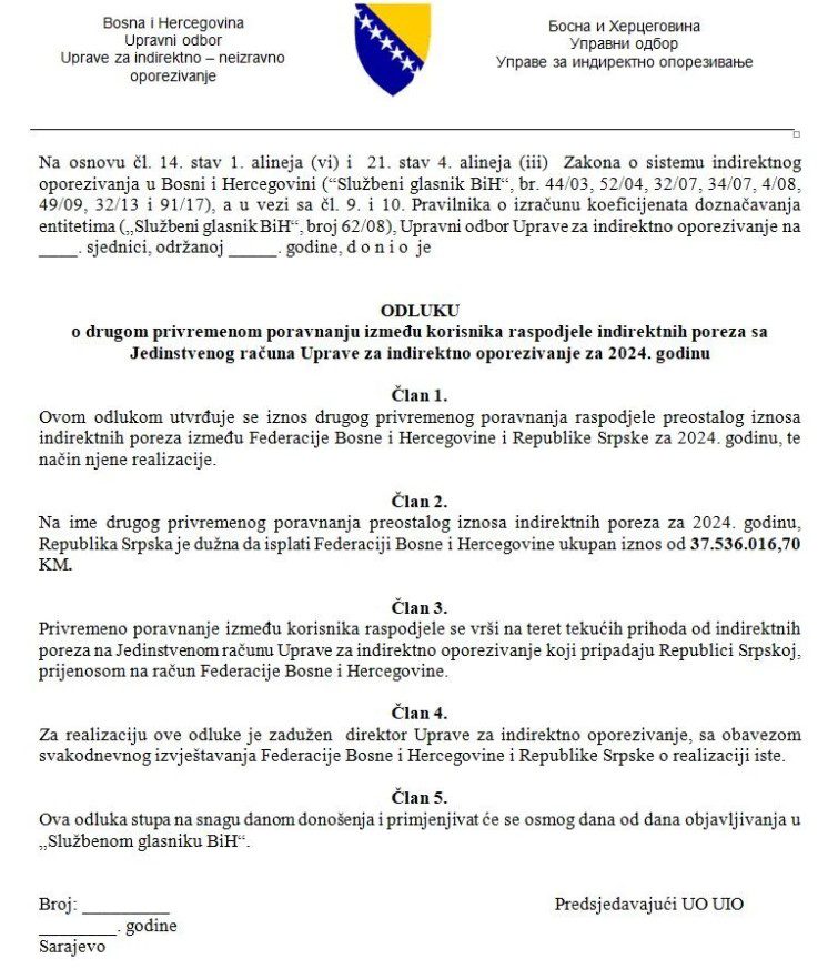 Od tada su “zaleđeni” procenti na koeficijentima (62,01 FBiH, 34,44 RS i 3,55 Brčko distrikt) iako bi se trebali utvrđivati novi na svaka tri mjeseca.