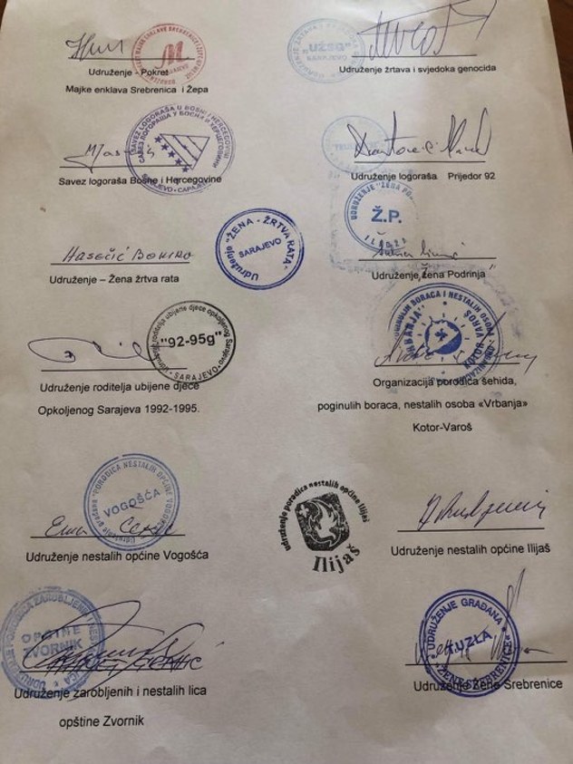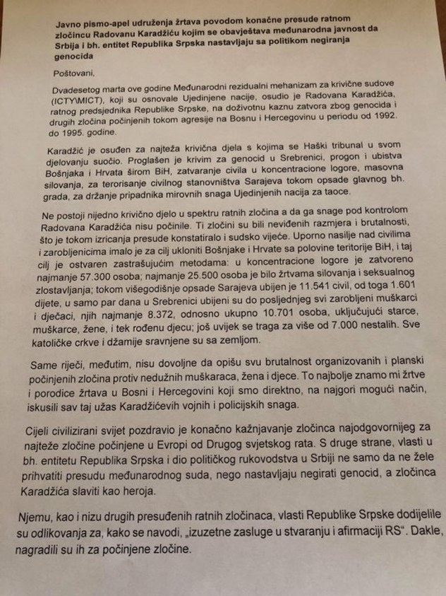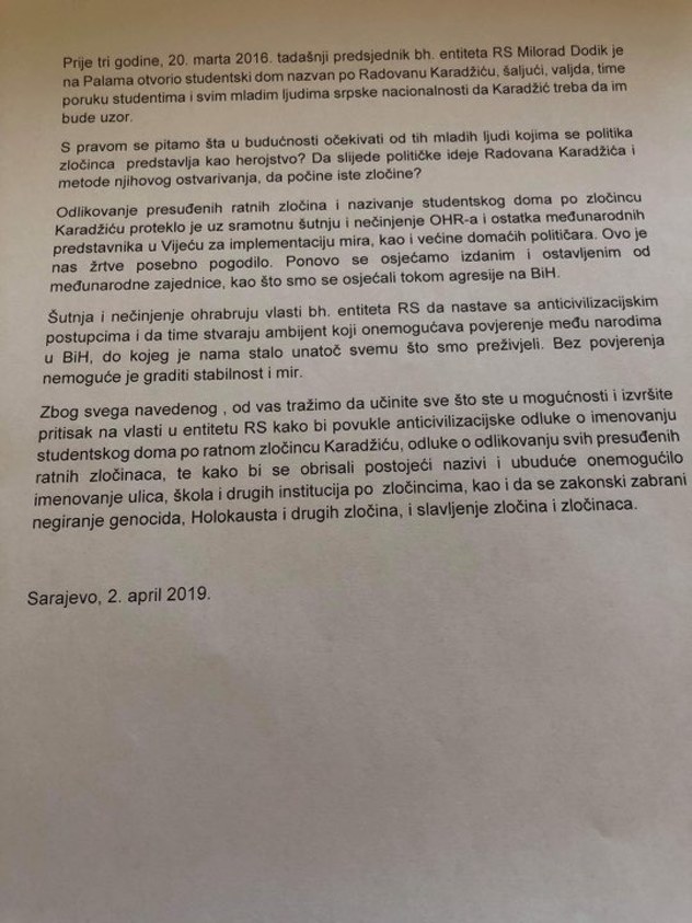 Zbog svega navedenog, od vas tražimo da u skladu sa svojim mandatom i ovlaštenjima koja proizilaze iz Dejtonskog mirovnog sporazuma naložite vlastima RS da stave van snage anticivilizacijske odluke o imenovanju studentskog doma po ratnom zločincu Karadžiću, te odluke o odlikovanju svih presuđenih ratnih zločinaca. Također tražimo, da koristeći ovlasti koje imate, na nivou Bosne i Hercegovine proglasite Zakon o zabrani negiranja genocida.