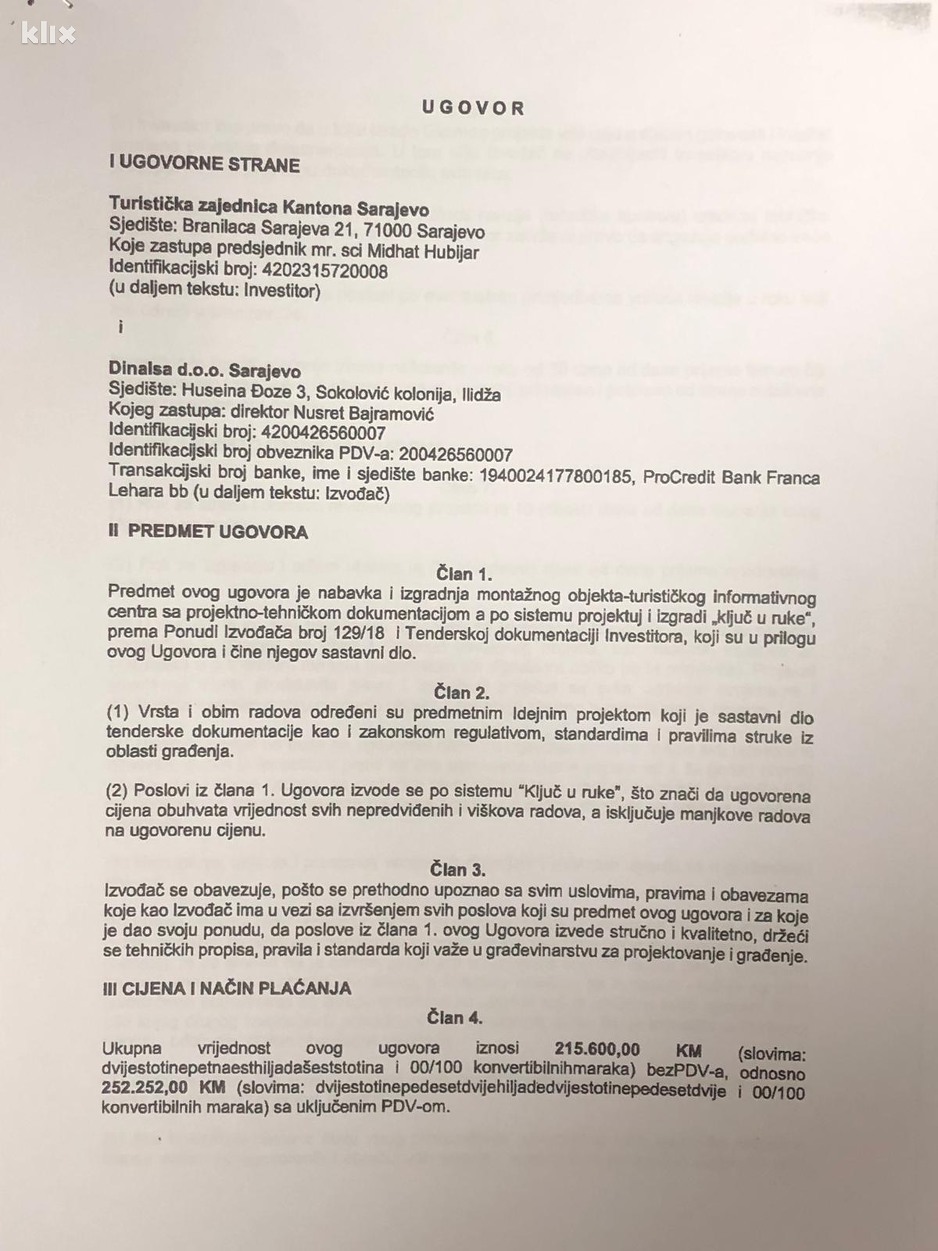 Ukupna vrijednost ugovora iznosi 215.000 KM, plus PDV, što čini konačnu cijenu od 252.000 KM.