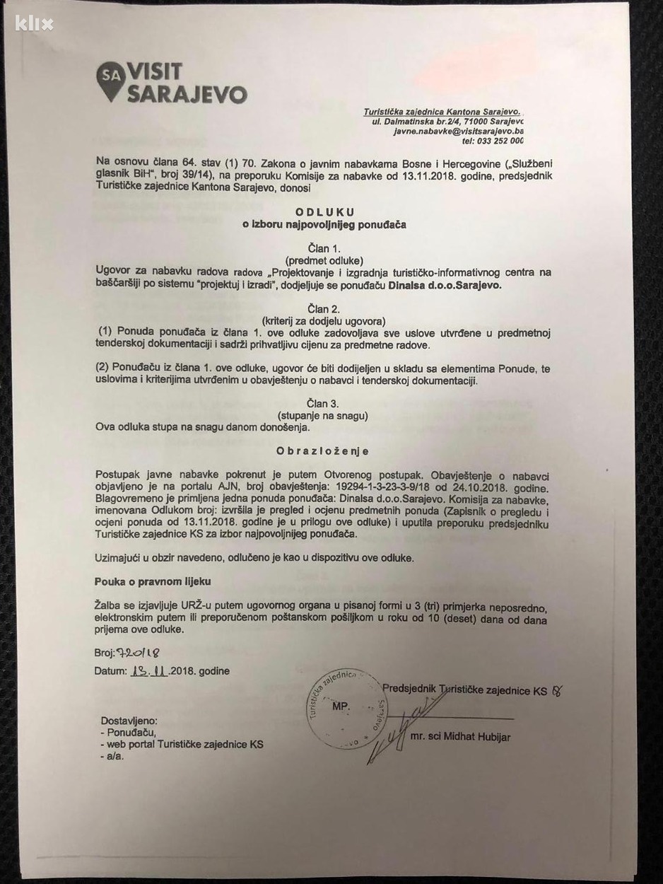 U odluci za izbor najboljeg ponuđača je navedeno da ponuđač zadovoljava sve uslove u tenderskoj dokumentaciji te sadrži prihvatljivu cijenu za radove.