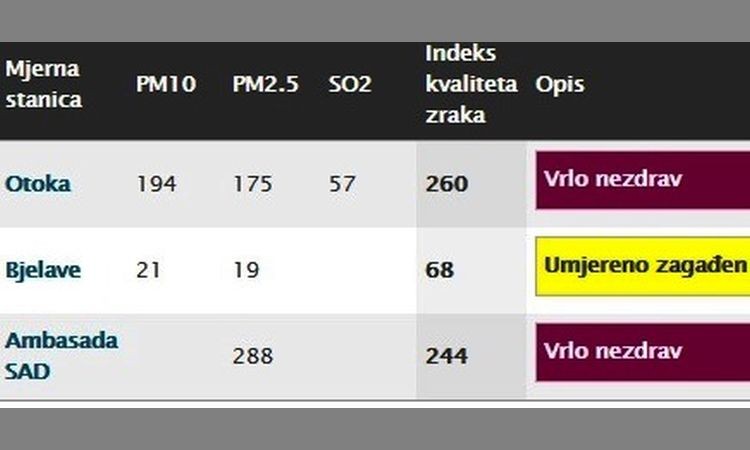 Vrijednost čestica PM10 jutros u 7.00 sati iznosila je 194 i to izmjerena na mjernoj stanici Otoka, dok je jučer u isto vrijeme vrijednost čestica PM10 na toj mjernoj stanici iznosila 292.