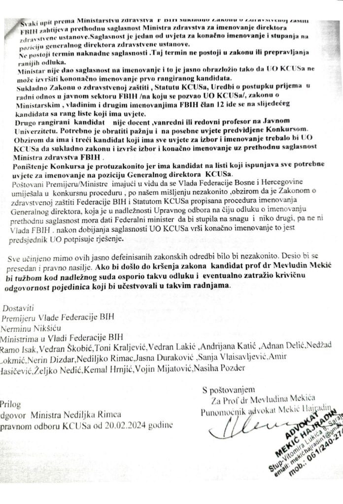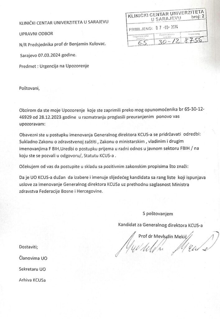 Trećerangirani kandidat na konkursu za imenovanje generalnog direktora, dr. Mevludin Mekić je u više navrata upozoravao UO KCUS-a, Ministarstvo zdravstva, ali i Vladu FBIH da moraju poštovati propisane procedure. U svojim dopisima on je naveo da je dužan da imenuju sljedećeg kandidata sa rang liste koji ispunjava uslove za imenovanje, a koji dobije saglasnost ministra. Upozorio je i da je poništenje konkursa protuzakonito sve dok postoje kandidati na listi koji ispunjavaju sve potrebne uvjete. U slučaju kršenja zakonskih odredbi dr. Mekić je najavio tužbe protiv odgovornih osoba i zatražio bi njihovu krivičnu odgovornost.