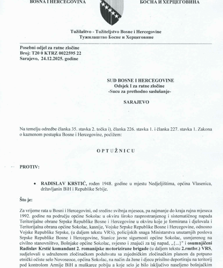 Tužilaštvo Bosne i Hercegovine podiglo je dva dana prije Nove godine optužnicu protiv Radislava Krstića, zloglasnog kasapina Ratka Mladića, zbog ratnog zločina počinjenog u mjestu Novoseoci kod Sokoca.