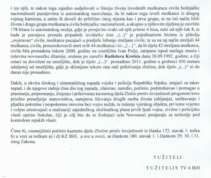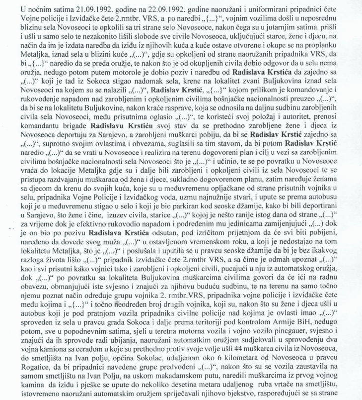 “Za vrijeme rata u Bosni i Hercegovini, od sredine maja mjeseca, pa najmanje do kraja septembra mjeseса 1992. godine na području općine Sokolac u okviru široko rasprostranjenog i sistematičnog napada Teritorijalne odbrane Srpske Republike Bosne i Hercegovine u okviru koje je formirana i djelovala i Teritorijalna obrana općine Sokolac, kasnije, Vojske Srpske Republike Bosne i Hercegovine, odnosno Vojske RS, (u daljem tekstu VRS), policijskih snaga Ministarstva unutarnjih poslova Srpske Republike Bosne i Hercegovine, Stanice javne sigurnosti općine Sokolac, usmjerenog na civilno stanovništvo, Bošnjake općine Sokolac, svjesno i znajući za taj napad, {…} i osumnjičeni Radislav Krstić, komandant 2. romanijske motorizirane brigade (u daljem tekstu 2.rmtbr.) VRS, sudjelovali u udruženom zločinačkom poduhvatu sa zajedničkim zločinačkim planom da potpuno etnički očiste selo Novoseoce, općina Sokolac, na način da žene i djecu prisilno deportiraju na teritorij pod kontrolom Armije BiH, a muškarce pobiju, a koje selo je bilo isključivo naseljeno bošnjačkim stanovništvom, čiji stanovnici su ranije tokom maja i jula 1992. godine u dva navrata predali naoružanje koje su imali i iskazali lojalnost vlastima na Sokocu, koja je bila isključivo u ruka pripadnika srpskog naroda, te time svjesno svojim radnjama osobno podržali i doprinijeli njegovom provođenju, {…} svjesni da svojim radnjama učestvuju u pripremi, organiziranju i izvršenju toga plana i realizaciji zajedničkog cilja {…} i Radislava Krstića, pristupili realizaciji tog plana.