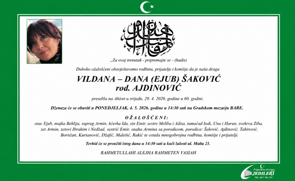 Dženaza će biti klanjana 4. maja na Gradskom groblju Bare, gdje će porodica, prijatelji i poštovaoci uputiti posljednji oproštaj. Njen odlazak predstavlja nenadoknadiv gubitak, a uspomena na nju živjet će kroz sve koji su je voljeli.