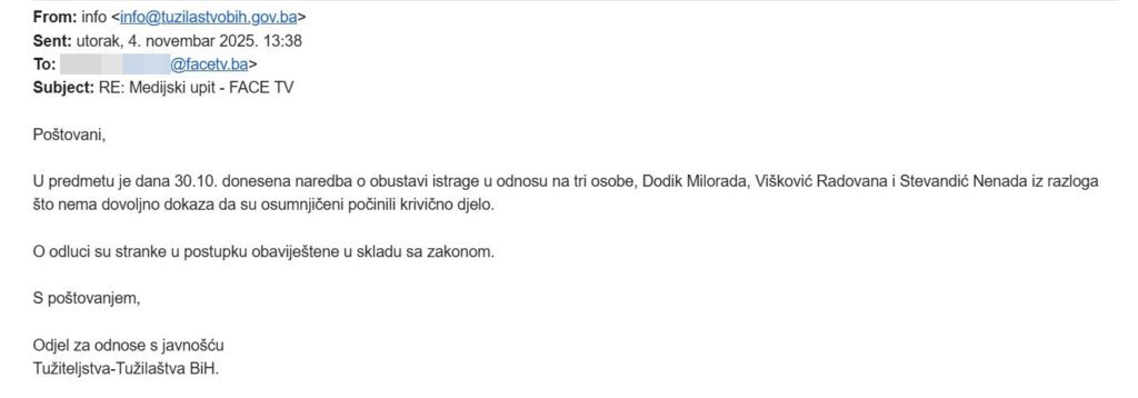Tragom ove informacije, FACE TV je poslala zvaničan upit ovoj instituciji. U nastavku objavljujemo njihov odgovor na pitanje o obustavi istrage protiv “trija” iz RS.