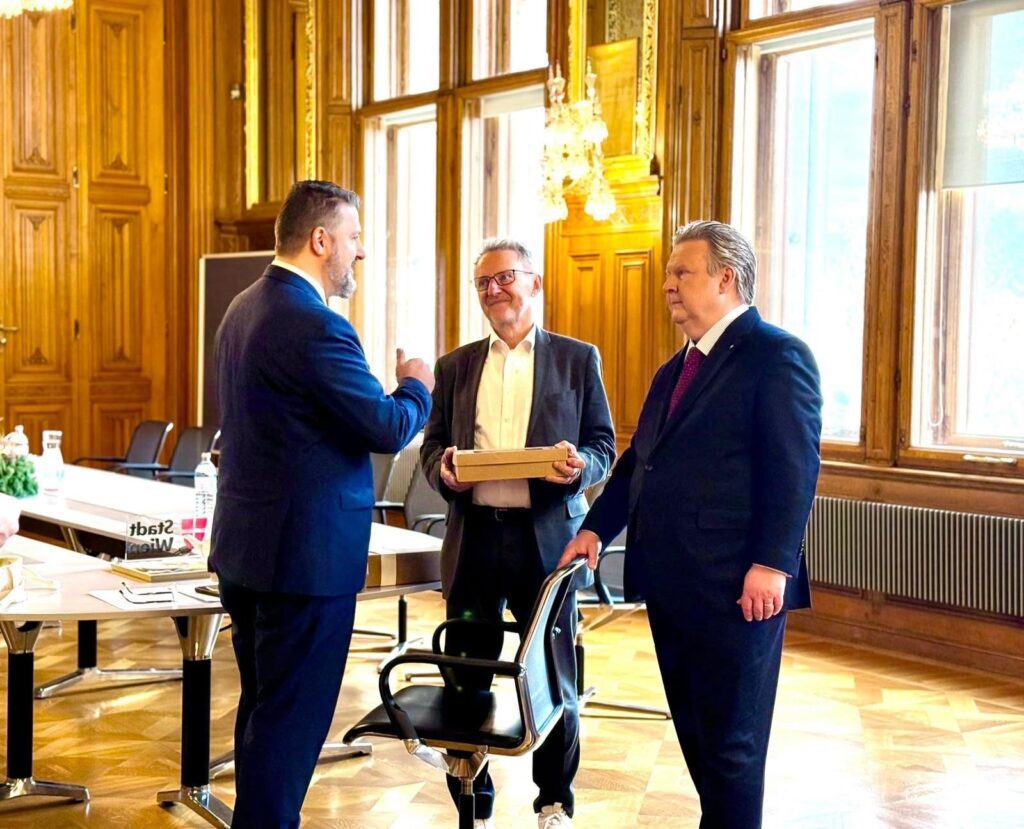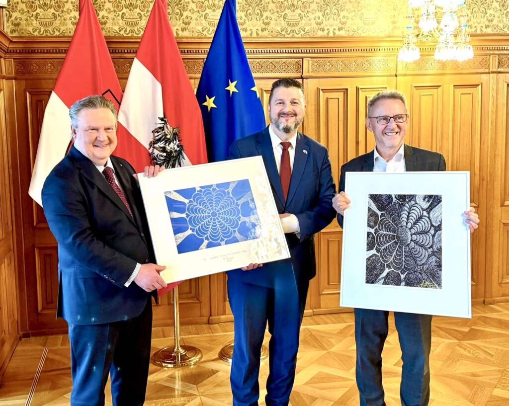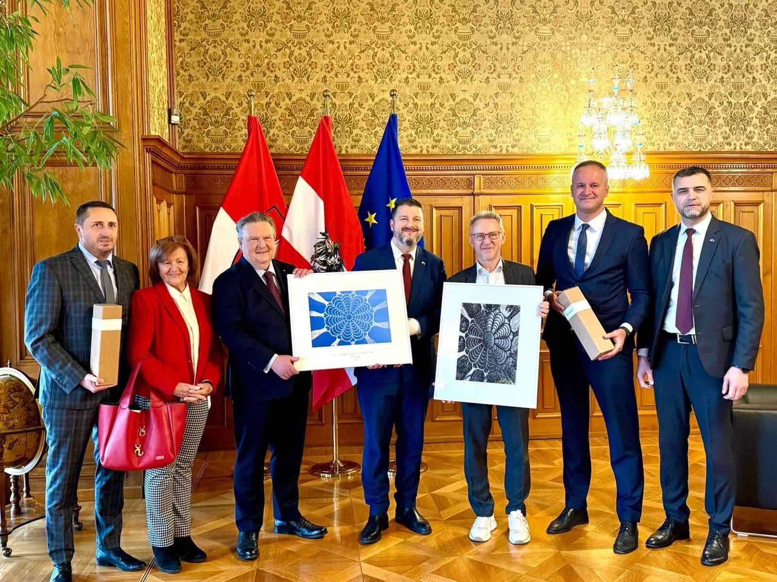 Tom prilikom delegacija je uručila gradonačelniku Michaelu Ludwigu i počasnom članu Saveza i bivšem predsjedniku Bečkog parlamenta, Ernstu Wolleru, simbolične poklone, uz zahvalnost za njihovu dugogodišnju podršku projektu izgradnje spomenika „Cvijet Srebrenice“ na Trgu Ujedinjenih nacija u Beču.