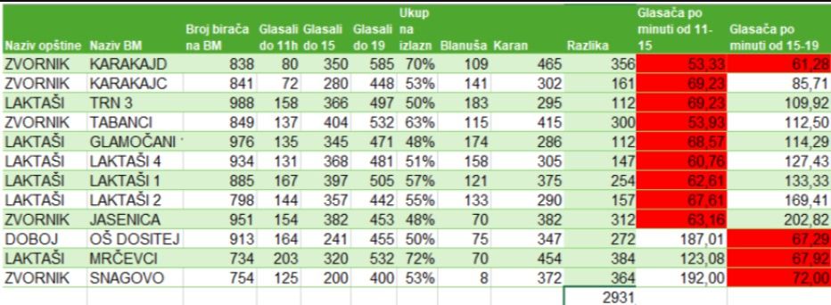 Sličan obrazac uočen je i ovaj put na ukupno 11 biračkih mjesta u Doboju, Zvorniku i Laktašima, gdje Siniša Karan ostvaruje razliku od više od 2.900 glasova. Na tim mjestima u pojedinim intervalima prosječno vrijeme glasanja iznosilo je između 50 i 70 sekundi, dok dodatnu sumnju izaziva nagli skok izlaznosti u posljednjim satima glasanja.