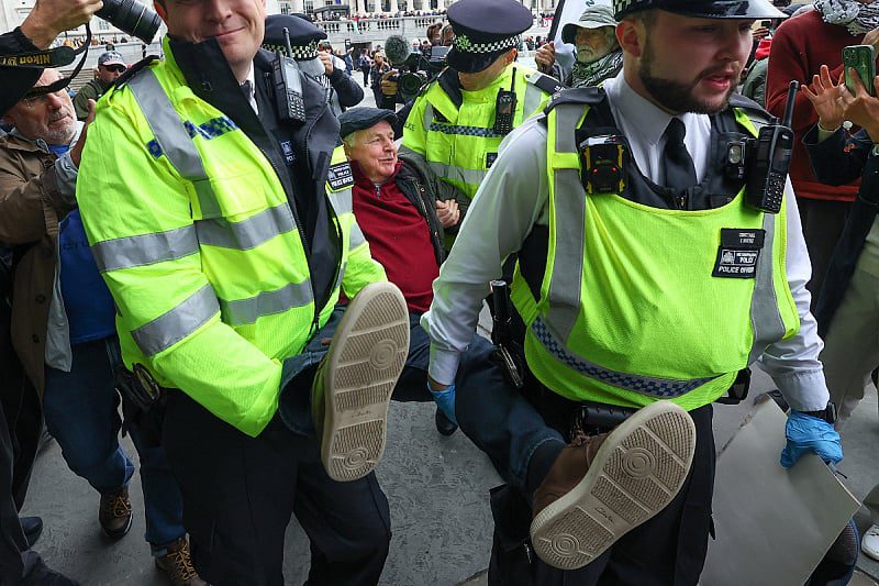 Stotine ljudi okupilo se na glavnom protestnom događaju na Trafalgar Squareu u centru Londona, gdje je policija počela odvoditi demonstrante dok su aktivisti koji su sjedili ispisivali slogane na transparentima kojima su izražavali podršku Akciji za Palestinu. Prolaznici su policajcima skandirali “sram vas bilo”.