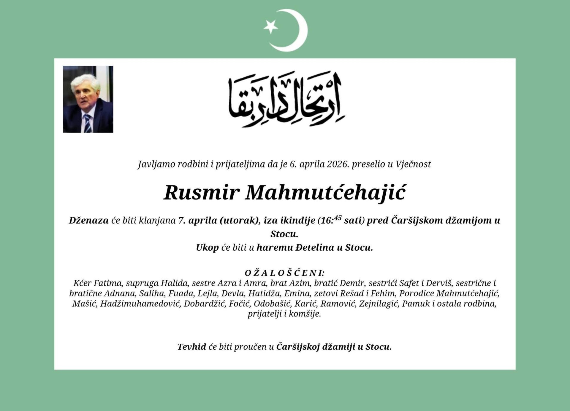 Dženaza-namaz Rusmiru Mahmutćehajiću bit će klanjana u utorak, 7. aprila, iza ikindije namaza u 16:45 sati, ispred Čaršijske džamije u Stocu, dok će ukop biti obavljen u haremu Detelina.