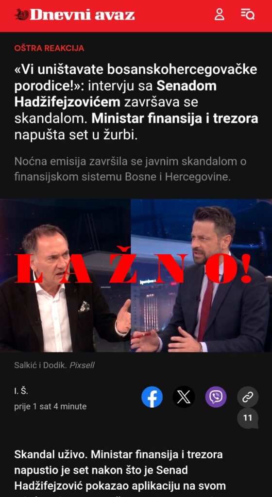 Primjer lažne sponzorisane objave koja zloupotrebljava identitet – označeno kao LAŽNO.