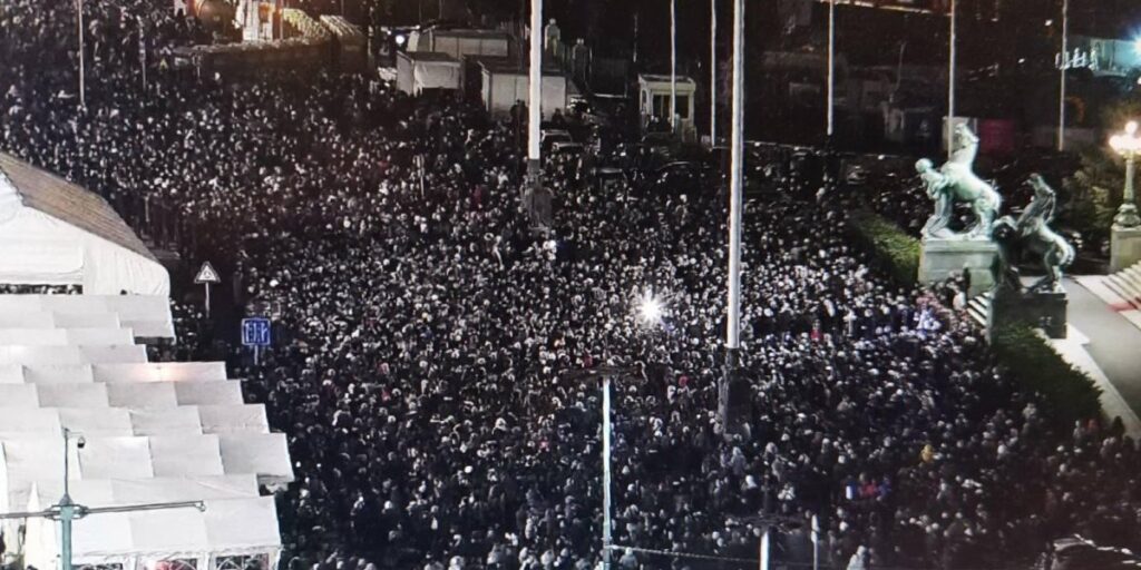 Ispred Doma Narodne Skupštine Srbije večeras se okupio veliki broj građana, a postavljeni su i štandovi za Božićno selo, koje će narednih nekoliko dana biti otvoreno za sve građane.